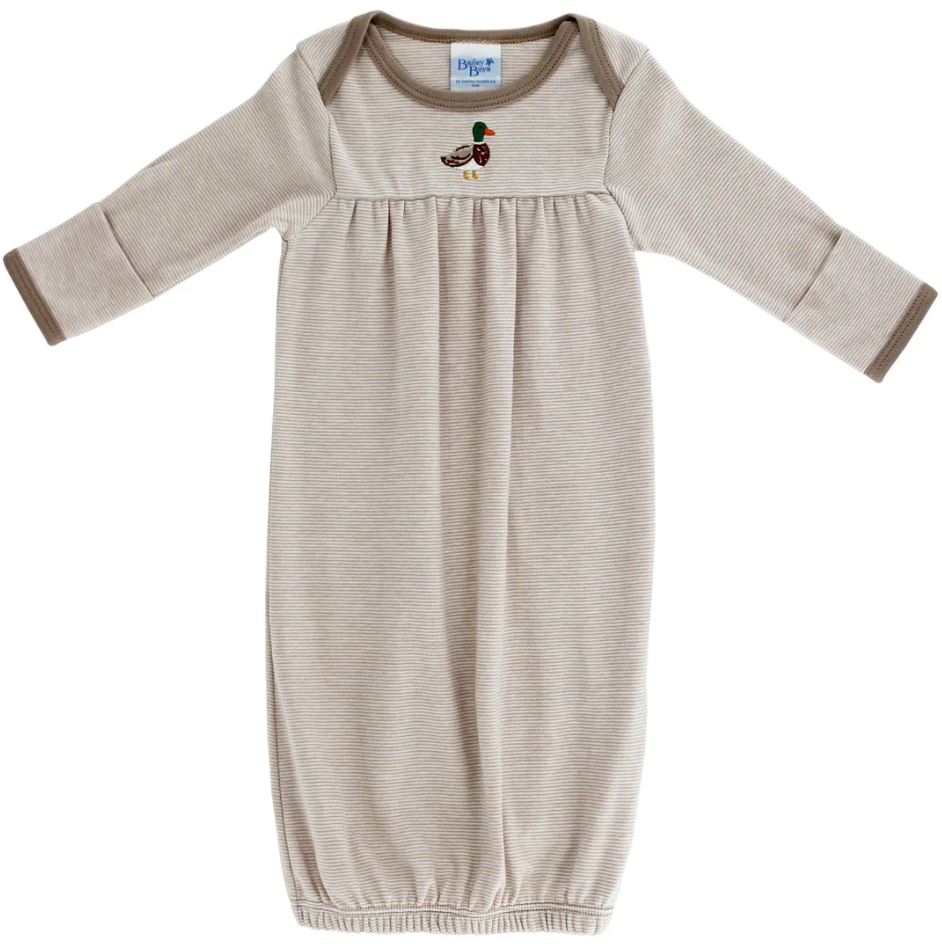 This cozy Mallard Sac is a charming blend of comfort and style. Designed in soft and neutral stripes with contrasting trim, it features a sweet embroidered mallard on the chest for a playful touch. The elastic bottom allows for easy diaper changes while the long sleeves keep little ones warm. Perfect for naptime, playtime, or anything in between, this sac is a practical yet adorable addition to any baby wardrobe.