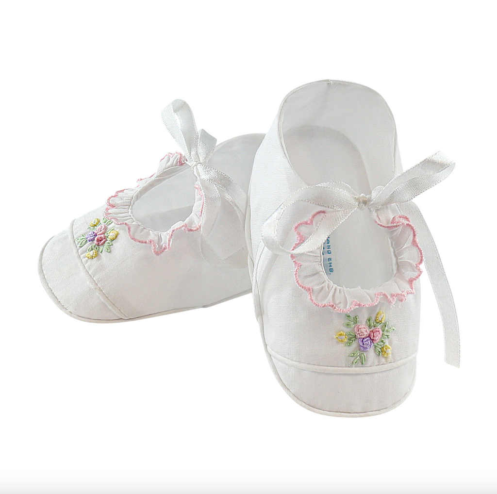 Classy, dainty booties for your baby girl! These vintage style baby booties match our Secret Garden Collection, with adorable fluted lace trim and hand-stitched rosebud bullions. A timeless accessory for your baby girl this spring!