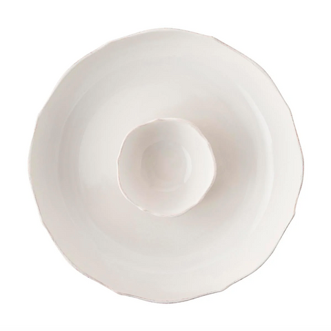 From our Berry & Thread Collection - Keep it chic with this 2 piece chip and dip server that elevates the humble to something a bit more special. Subtly embellished with fluting and our berry and thread motif, a central bowl is surrounded by a larger basin to easily present your favorite chips and dips - with a splash of elegance.