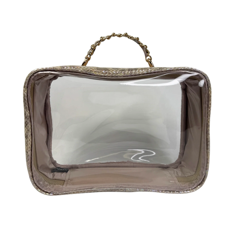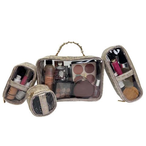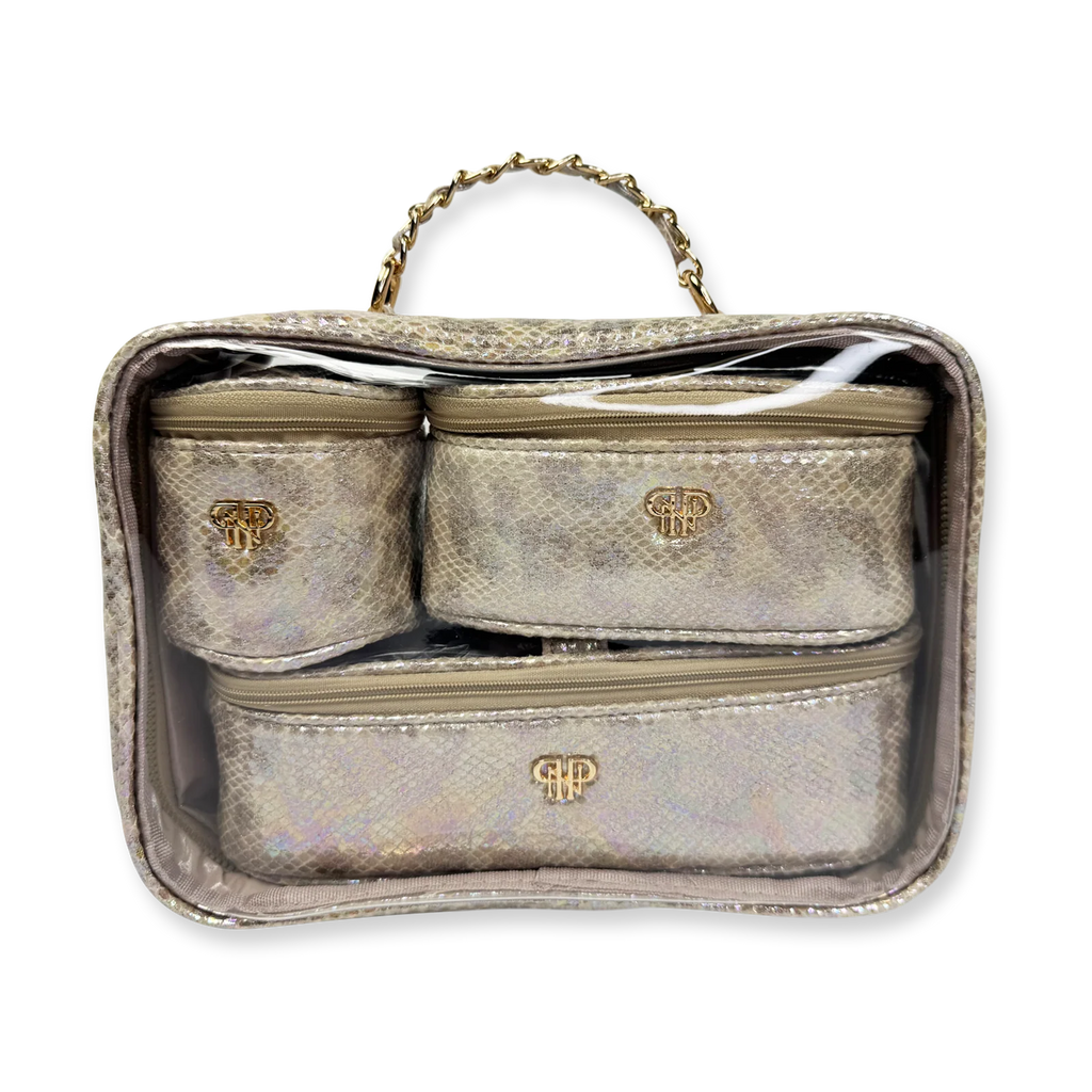 The Trio Jet Setter is your four-in-one answer to beauty on the go - elegant, organized, and effortlessly chic. The chic Glimmer Leopard takes sophisticated to a whole new level. Inside the clear, structured case with designer inspired chain handle are three removable companion cases (extra small, small, and medium), perfectly sized to keep your makeup, skincare, and everyday essentials in flawless order. Whether you're heading to the office, the gym, or a weekend escape, the Trio Jet Setterkeeps everything in place - and your routine looking fabulous every step of the way.