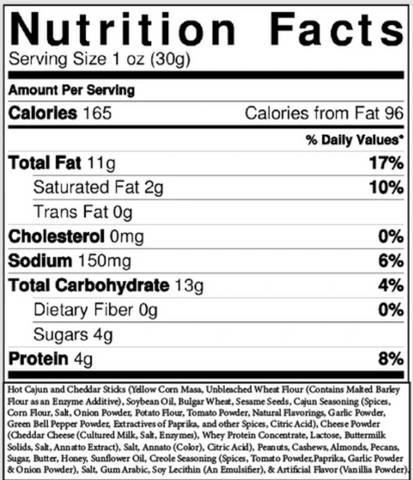 Ingredients: Hot Cajun and Cheddar Sticks (Yellow Corn Masa, Unbleached Wheat Flour (Contains Malted Barley Flour as an Enzyme Additive), Soybean Oil, Bulgar Wheat, Sesame Seeds, Cajun Seasoning (Spices, Corn Flour, Salt, Onion Powder, Potato Flour, Tomato Powder, Natural Flavorings, Garlic Powder, Green Bell Pepper Powder, Extractives of Paprika, and other Spices, Citric Acid), Cheese Powder (Cheddar Cheese (Cultured Milk, Salt, Enzymes), Whey Protein Concentrate, Lactose, Buttermilk Solids, Salt, Annatto Extract), Salt, Annato (Color), Citric Acid), Peanuts, Cashews, Almonds, Pecans, Sugar, Butter, Honey, Sunflower Oil, Creole Seasoning (Spices, Tomato Powder, Paprika, Garlic Powder & Onion Powder), Salt, Gum Arabic, Soy Lecithin (An Emulsifier), & Artificial Flavor (Vanilla Powder).