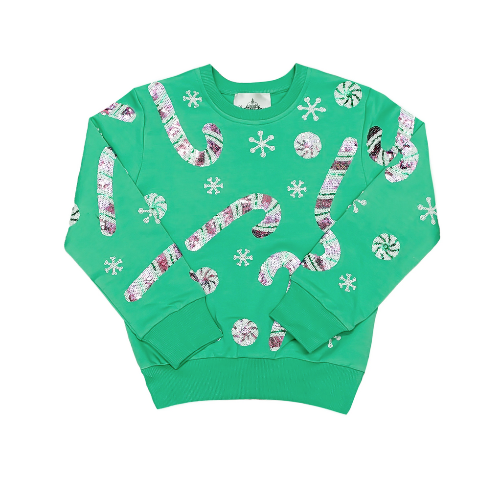 Wrap yourself in cozy charm with this Belle Cher Candy Cane Teal Sweatshirt! Featuring a delightful candy cane design against a soothing teal backdrop, it's the perfect blend of whimsy and comfort. Whether you're channeling festive vibes year-round or adding a pop of personality to your everyday wardrobe, this sweatshirt delivers softness and style in one delightful package. A playful piece that brings joy to any outfit.