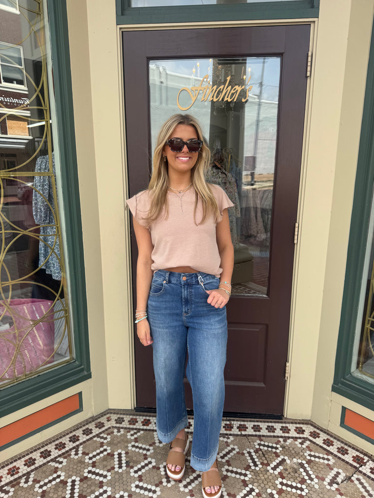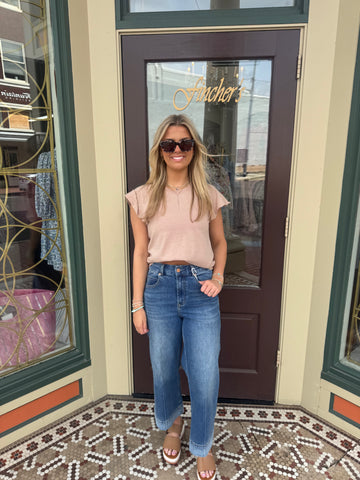 Audrey wide leg jeans in lagoon medium wash offers a contemporary fit with a flattering high rise, designed to elevate fashion with a modern edge & tonal washed hem. Crafted from a soft blend of 98% cotton and 2% spandex, these versatile outfits provide a comfortable option for women who value both style and ease. The stylish raw cut hem and cropped inseam add a chic, relaxed finish, making these jeans perfect for any casual or dressy occasion.