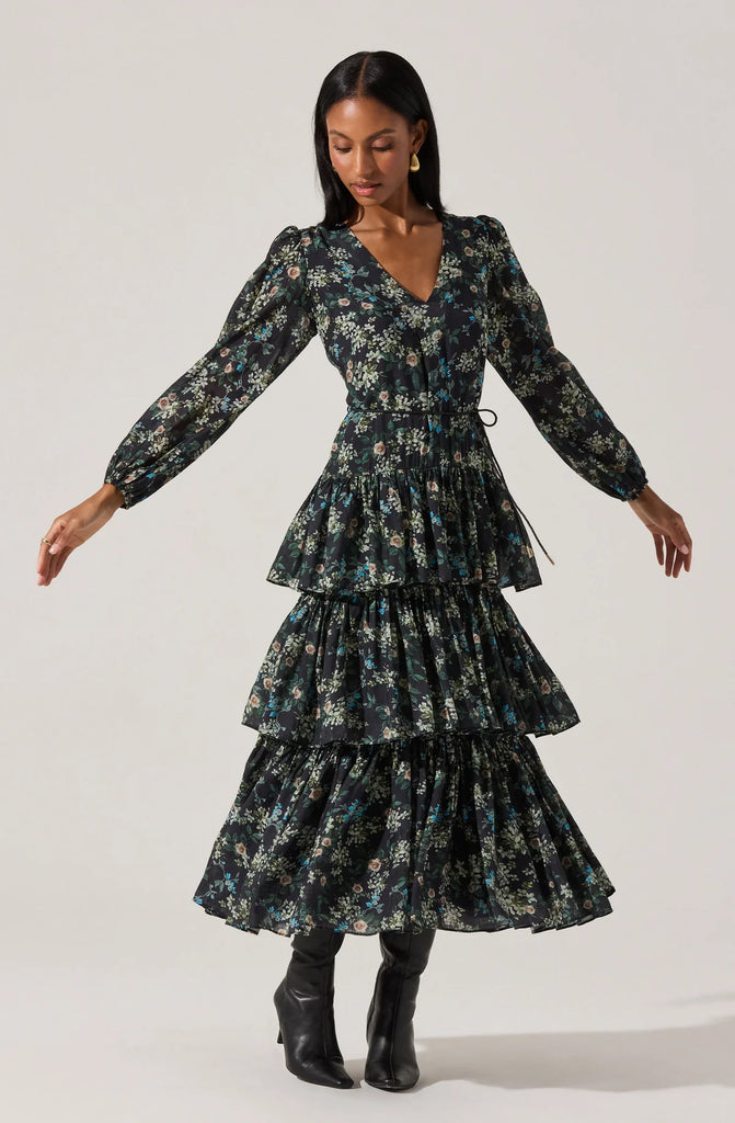 This Franchesca Midi Dress in black and green features a tiered ruffle skirt and a flattering V-neckline with subtle balloon sleeves, combining sophistication with comfort. Designed with a detachable faux leather braided belt and threaded belt loops, it allows for personalized styling. Fully lined except for the sleeves and finished with a concealed back zipper, this dress offers a smooth fit. Made from a cotton-nylon blend with a rayon lining, it is best cared for with dry cleaning to maintain its refined appearance. Ideal for casual gatherings or daytime events, it blends ease and elegance effortlessly.