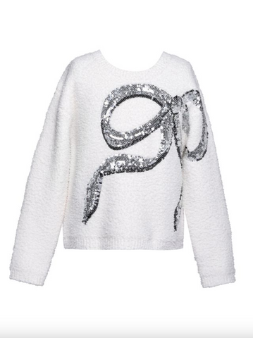 This Hannah Banana-Knit Pullover Sweater combines cozy knitwear with elegant detailing. Featuring a delicately embroidered bow adorned with sequins, it adds a subtle sparkle to classic comfort. Ideal for layering or wearing on its own, this sweater balances warmth and style with refined craftsmanship suitable for sophisticated casual wear.