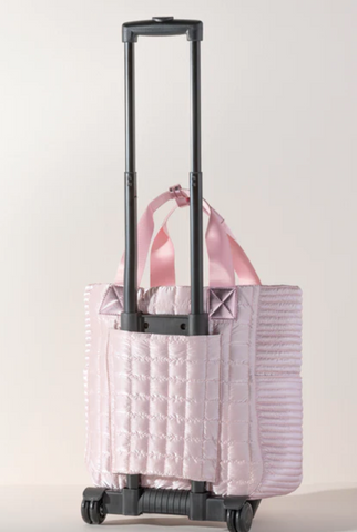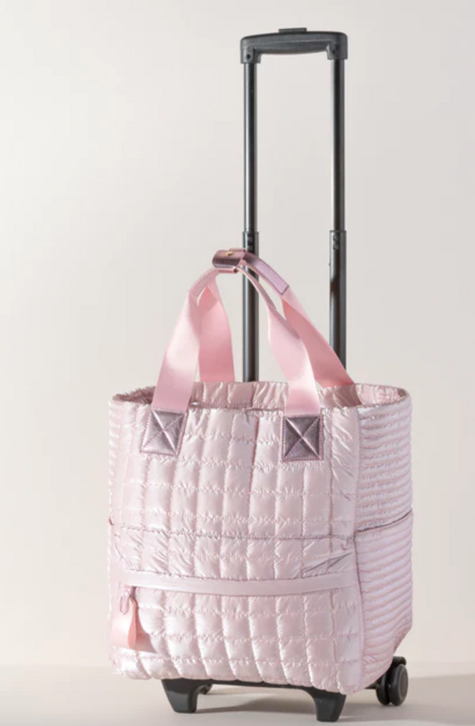 Shine bright and roll smoothly into your next destination with Shiraleah’s Logan Roller Tote. This versatile tote features a sleek rose gold metallic fabric, double handles with removable handle wrap, and an extending roller handle. This is an ideal bag to travel with due to its practicality and portability. In addition to its convenient wheeling structure, it provides plenty of compartments for any odds and ends that you may need during your trip! Pair with the matching Logan Travel Tote or other Shiraleah items to complete your look!