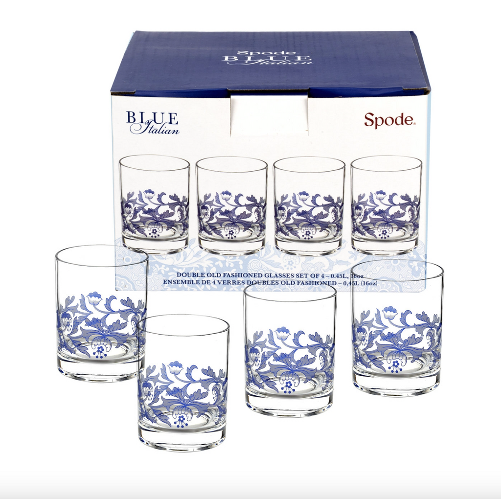 This stunning Blue Italian set of 4 double old fashioned glasses from Spode will add an extra touch of elegance to your dinner table. The 4 double old fashioned glasses feature the iconic 18th century Imari Oriental border in Blue Italian’s deep blue colorway. Hand wash only.