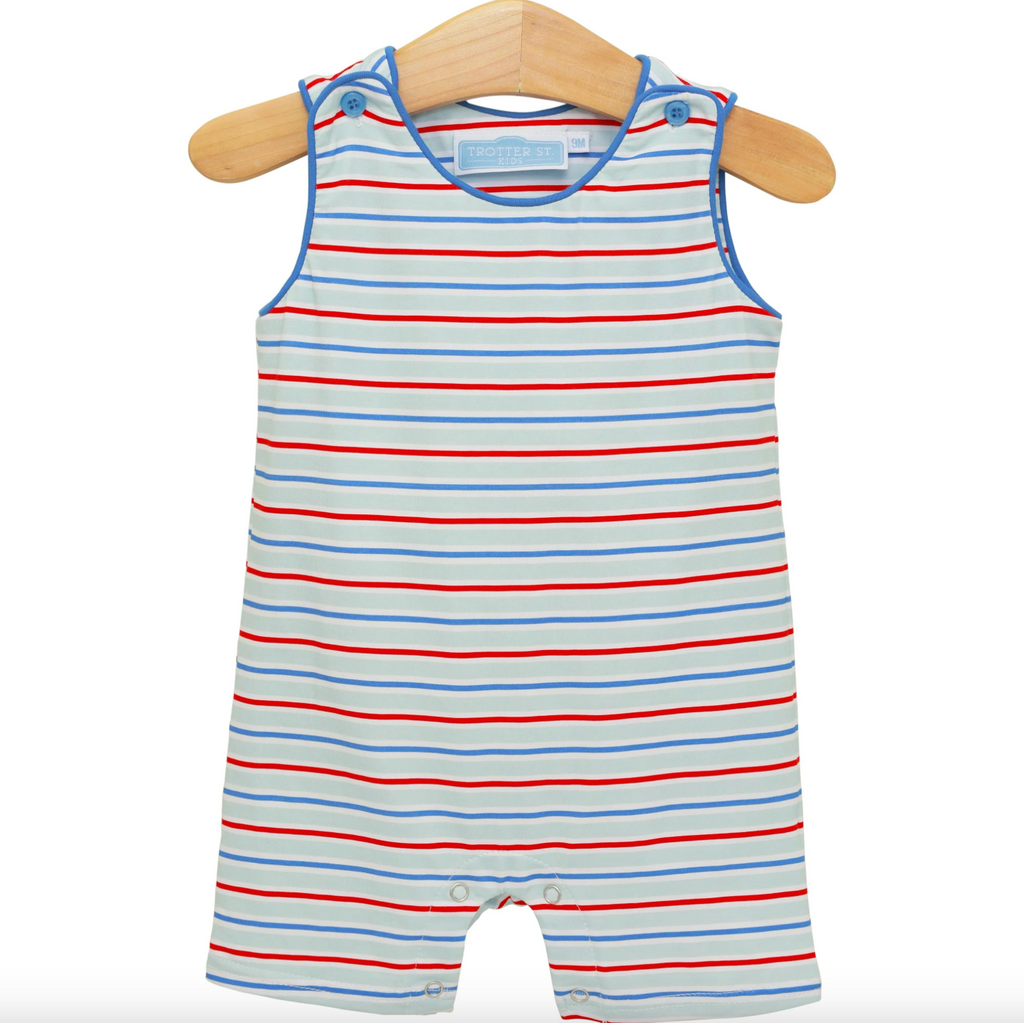 Hop into patriotic style with this charming Trotter Street Campbell Jon Jon featuring bold red, white, and blue stripes! Perfect for little ones who love to celebrate with flair, this playful one-piece combines comfort with festive spirit. The classic jon jon silhouette keeps things timeless while the patriotic palette adds a fun pop of personality. Ideal for holidays, parades, or any day that calls for star-spangled style!