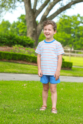 Celebrate in style with the Trotter Street-Drew Short Set in Patriotic Stripe! This cheerful two-piece features bold red, white, and blue stripes that bring festive flair to any occasion. Perfect for summer adventures, parades, or patriotic celebrations, the comfortable short set keeps kids looking sharp while staying cool. Mix-and-match pieces let little ones express their personality, making this set a versatile wardrobe essential that's as fun to wear as it is to show off.