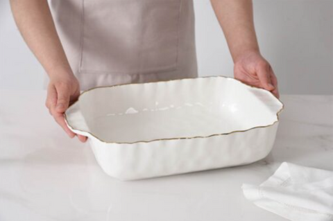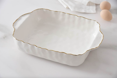 11″ x 9″ Rectangular Baking Dish in Portofino. Its spacious dimensions make it ideal for preparing family-sized casseroles, lasagnas, roasted vegetables, and desserts. With sturdy handles for secure grip and a timeless look that transitions seamlessly from oven to table, this baking dish is as practical as it is stylish. Beautifully crafted white porcelain with a delicate gold trim. Food safe, tarnish free, dishwasher safe, oven safe to 500°F. Easy Care. Capacity: 2.5 Qt
