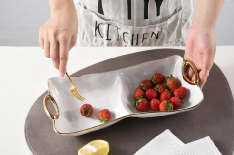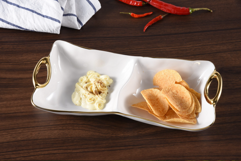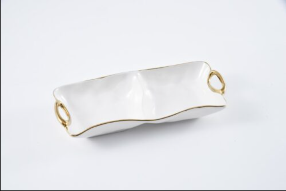 2 Section Server in Golden Handles. Great for serving your favorite pairs! Think chips and dip, hummus and veggies or apples and peanut butter. Stunning white porcelain with smooth and fluent handles in gold titanium. Food safe, dishwasher safe, oven safe to 500°. Easy Care.
