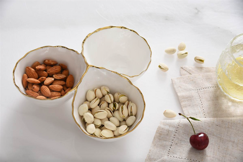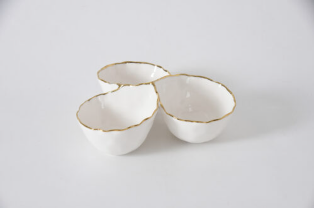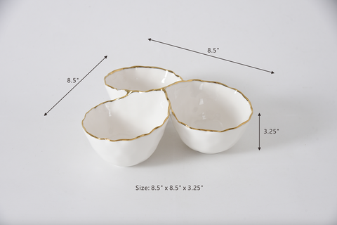 3 Section Server in Portofino. This server provides seamless options for presenting condiments, snacks, dips, or other accompaniments with ease. Made from premium white porcelain, each section is adorned with a delicate gold trim that exudes sophistication and charm. Designed for both beauty and functionality, this piece is a fabulous addition for entertaining or everyday use. Food safe, tarnish free, dishwasher safe, oven safe to 500°F.