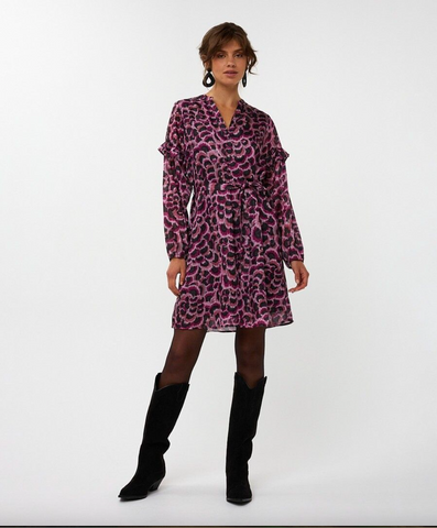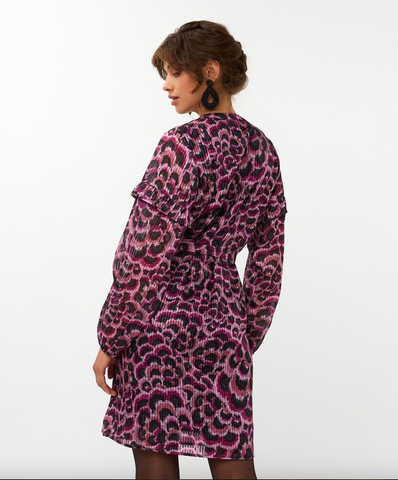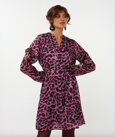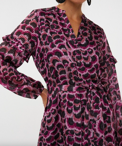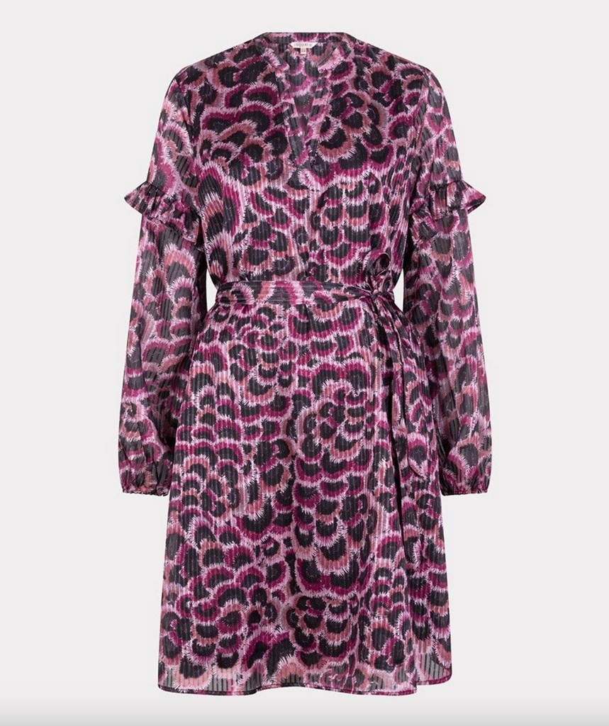 Short dress in our Feather Flow print with flounce sleeves and a bow belt at the waist. The fabric is woven with lurex thread, which creates a subtle shimmer.