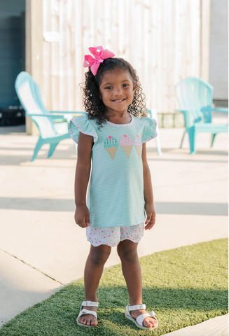 Scoop up the sweetest summer style with this adorable triple-scoop flutter short set! Featuring charming ice cream cone graphics and playful flutter sleeves, it's the perfect outfit for little ones who love all things fun and whimsical. Soft, comfortable fabric keeps kids cool during warm weather adventures. Mix-and-match pieces let you create multiple looks from one delightful set. Pure joy in every wear!